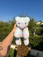This crochet bear measures about 9 inches tall while sitting and 16 inches long from end to end while laying flat with the legs out.